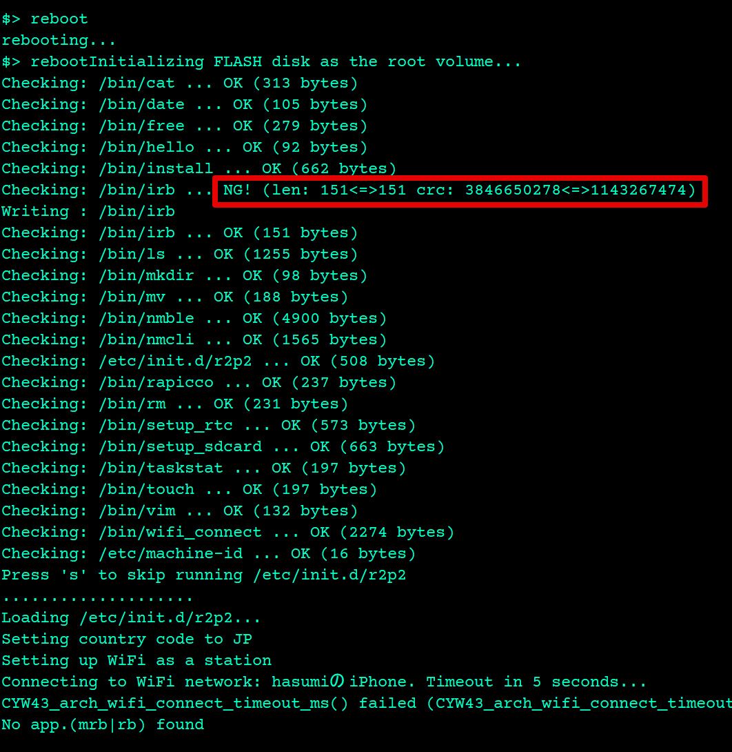 again - If the same file check fails again, or if another file fails, it is suspicious that the flash ROM state has become corrupted